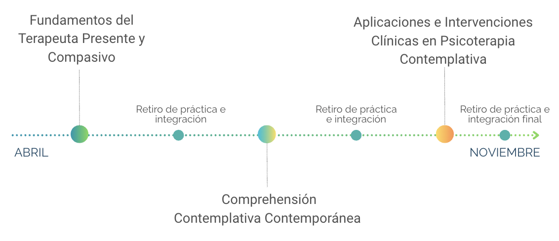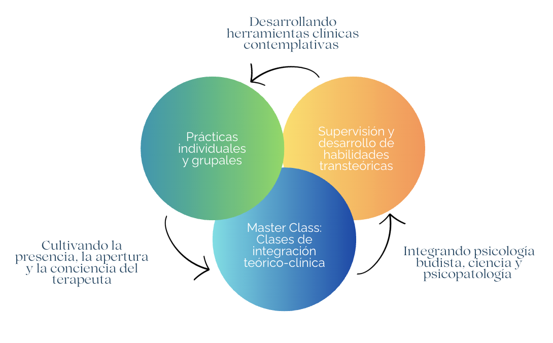 El programa incluye aprendizaje experiencial con prácticas meditativas que promueven el autoconocimiento y el desarrollo de habilidades, un aprendizaje conceptual, centrado en nociones de psicología contemplativa, neurociencias clínicas y psicopatología, incluyendo modelos de desarrollo, vulnerabilidad y resiliencia, y un aprendizaje didáctico, centrado en habilidades terapéuticas trans-teóricas. Especial énfasis se hace en el desarrollo de la persona del terapeuta durante el proceso de aprendizaje.