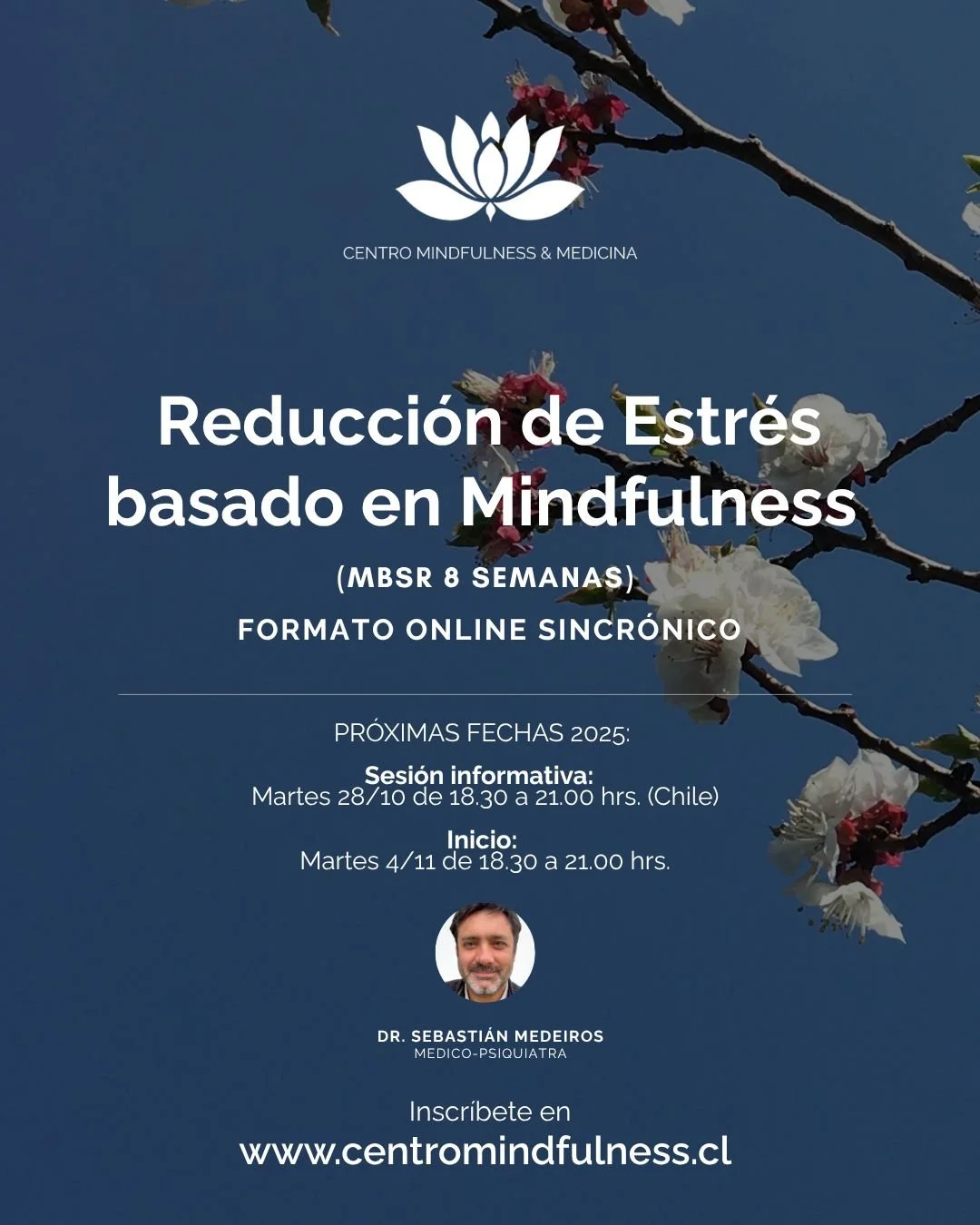 Instructor: Dr. Sebastian Medeiros. Médico de la Universidad Católica de Chile y Psiquiatra de la Universidad Paris VII. Instructor MBSR calificado por el Mindfulness Center de la la Universidad de Brown. Investigador en Instituto Milenio para la Investigación en Depresión y Personalidad (MIDAP).